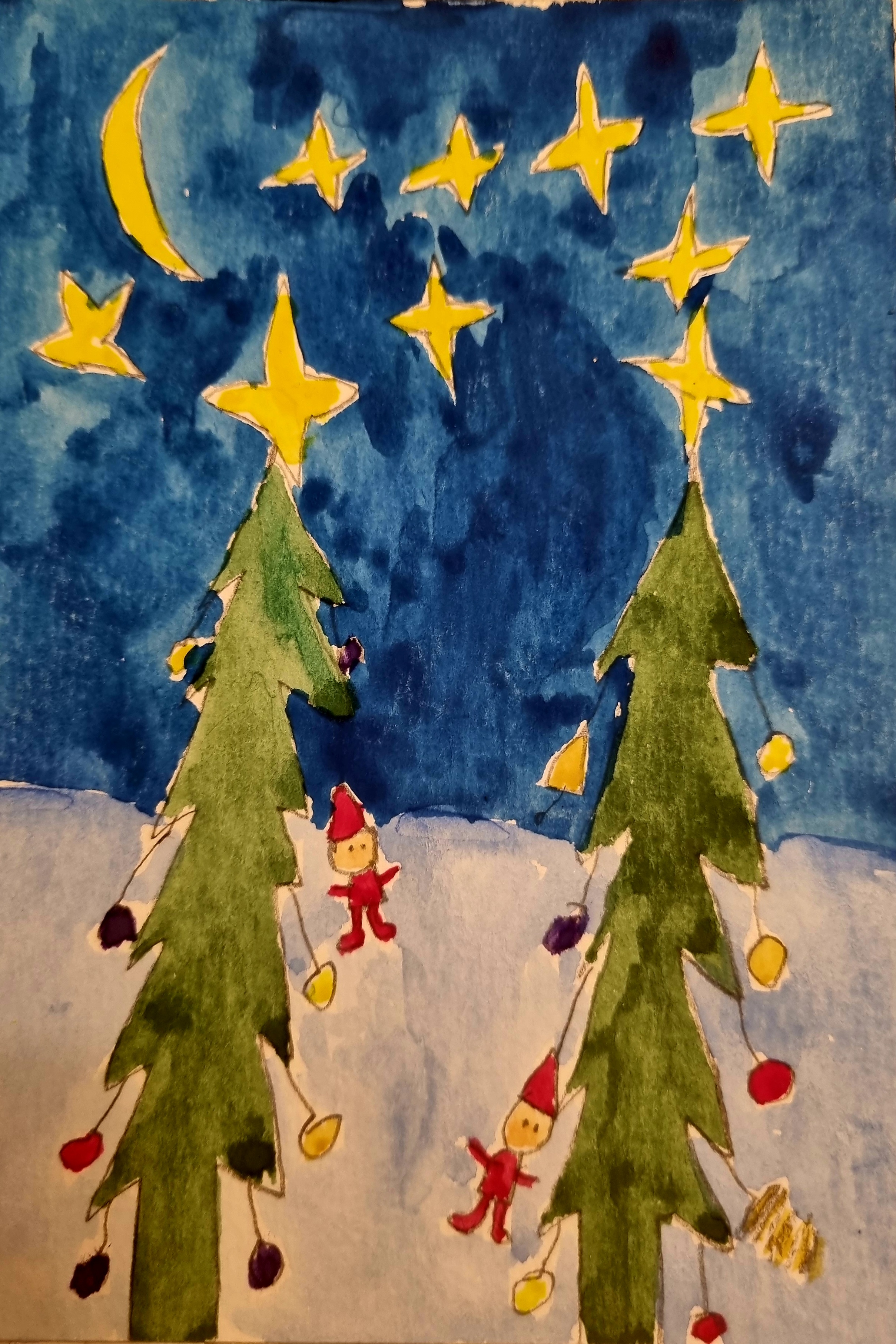 Yleisimmät valmiiden korttien aiheet ovat tontut, joulupukki, joulukuusi, eläimistä kissa, linnuista punatulkut, joskus tiaiset, maisemat ja kirkot, joskus jouluinen kaupunki. Lapset ja enkelit ovat myös suosittuja, lintujen lyhde ja joulukukat. Kävin läpi joulukorttien aiheita, kun maalasin omia korttejani. Korttien jouluaiheista inspiroituneena maalasin sitten jouluisia kuvia korteista ja omista valokuvistani. Yritän nyt pitää sitä perinnettä jatkossakin yllä. Lähetän kortteja niillekin, jotka eivät meitä muista, mutta minä haluan muistaa.